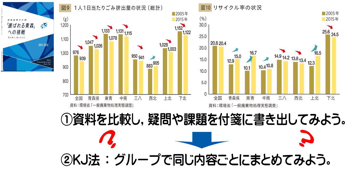 教員の資質・能力の向上を図り、これからの学校教育について提案性のあるものを模索し、主体的な活動を促すための課題設定の研究を進めました。そして、新学習指導要領において、育成を目指す資質・能力のうち「学びに向かう力・人間性等を涵養すること」に結びつける指導法の工夫として、総合的な学習の時間や総合的な探究の時間における課題設定場面を想定し、青森県総合基本計画「選ばれる青森への挑戦」の資料の活用方法について提案しました。 |