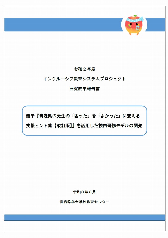 | 研究テーマ | 冊子『青森県の先生の「困った」を「よかった」に変える支援ヒント集【改訂版】』を活用した校内研修モデルの開発 |